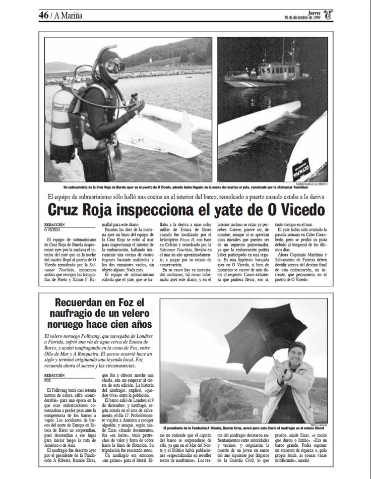 Lo averiguaremos tres días después, el 29 de diciembre, cuando La Voz de Galicia informa de la reaparición del navío, esta vez a cinco millas al norte de Estaca de Bares, donde la embarcación de rescate Salvamar Touriñán se hace cargo de él y lo remolca al puerto de O Vicedo, en la Mariña lucense.