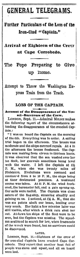 «La Corte dictamina que el barco de Su Majestad Captain se hundió en la mañana del 7 de septiembre de 1870, por la presión del velamen, asistido por el oleaje del mar, y que el velamen desplegado en el momento de su pérdida (teniendo en cuenta la fuerza del viento y el estado del mar) era insuficiente para poner en peligro un barco dotado de la debida estabilidad.