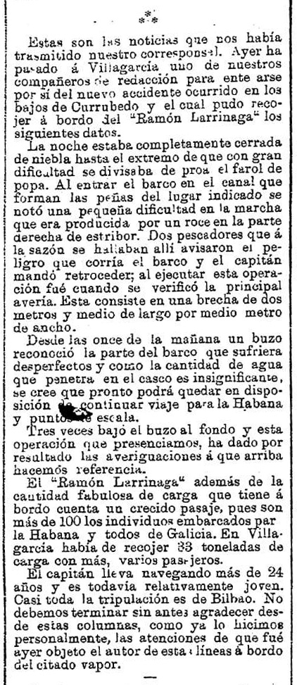 «Al entrar ayer en la ría de Villagarcía, Galicia, el vapor Ramón Larrinaga, chocó con una piedra, teniendo que fondear precipitadamente en el puerto haciendo agua.
