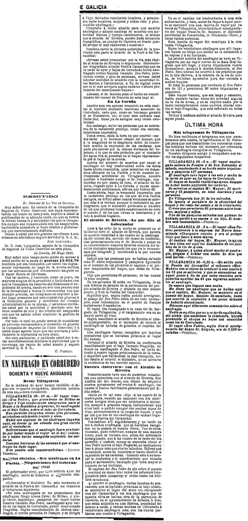 ¿Una curiosidad menor? Seguro. Lo realmente llamativo viene después. Porque justo tras esas cuarentaytantas líneas de autobombo publicitario a cuenta de La Unión Comercial aparece otra noticia que refrenda nuestra fe en las coincidencias… Llena prácticamente trescientas líneas para explicar los pormenores de un suceso que nos manda de vuelta a la primera frase de este post: el naufragio del Dom Pedro en Corrubedo.