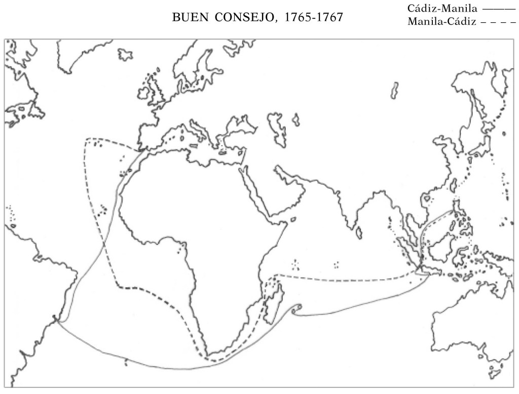 El viaje continuó. El 21 de diciembre la nave fondeó en islas Mauricio. Allí quedaron varados esperando la llegada del monzón. El 9 de mayo pudieron seguir camino. Driblaron varias islas (Java, Lucipara, Pulo Taya, Pulo Aor, Pulo Cóndor, Pulo Zapara…) hasta que, tras casi catorce meses de travesía, el Buen Consejo entraba en la localidad filipina de Cavite a las cuatro de la tarde del lunes 9 de junio de 1766.