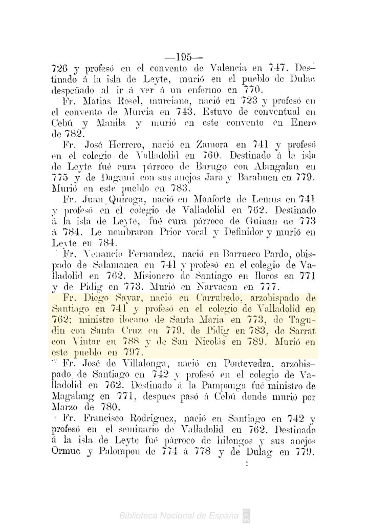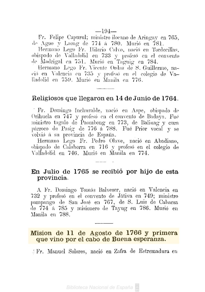 Su larguísimo título no podía ser más revelador de lo que nos topamos hojeando sus páginas: innumerables listas de nombres de frailes salpimentadas con breves apuntes sobre sus vidas, principiando por los de la expedición que lideró el almirante Miguel López de Legazpi en 1565. Nosotros vamos a avanzar dos siglos y detenernos en la página 194: