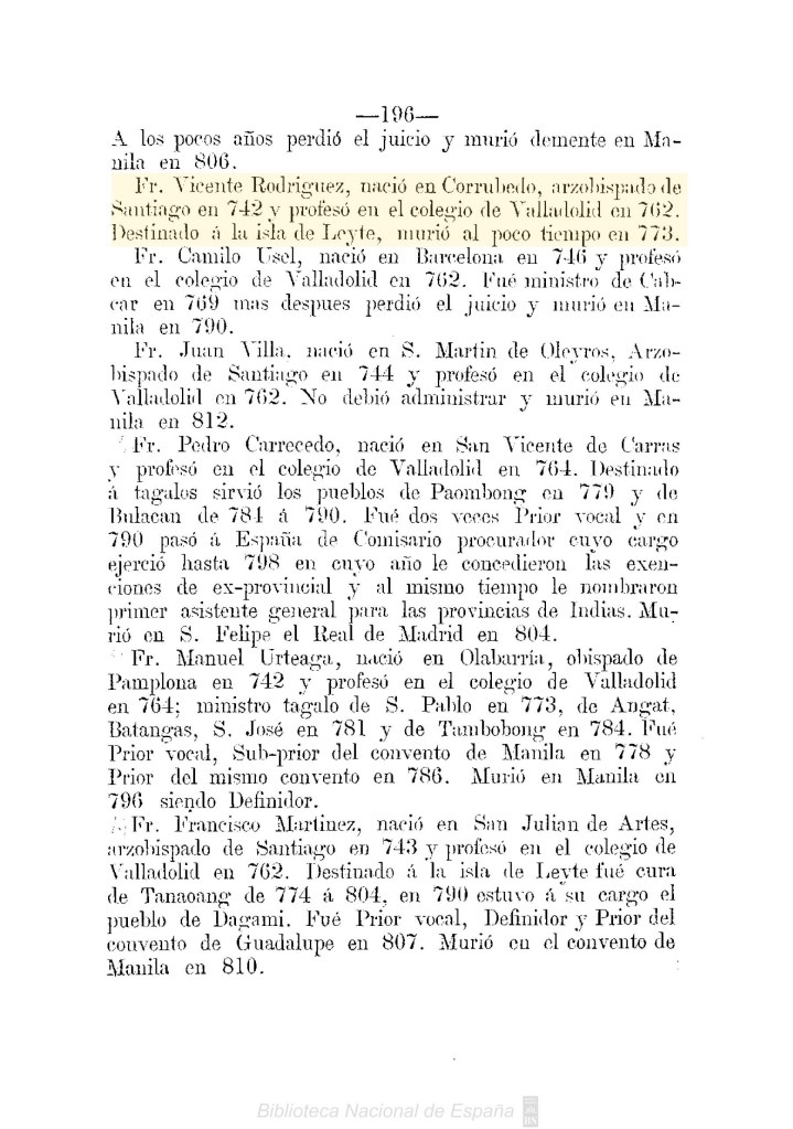 Fray Vicente Rodríguez, nacido en 1742, no tuvo una vida tan dilatada. Falleció en la isla de Leyte, situada al este, poco después de cumplir los treinta.