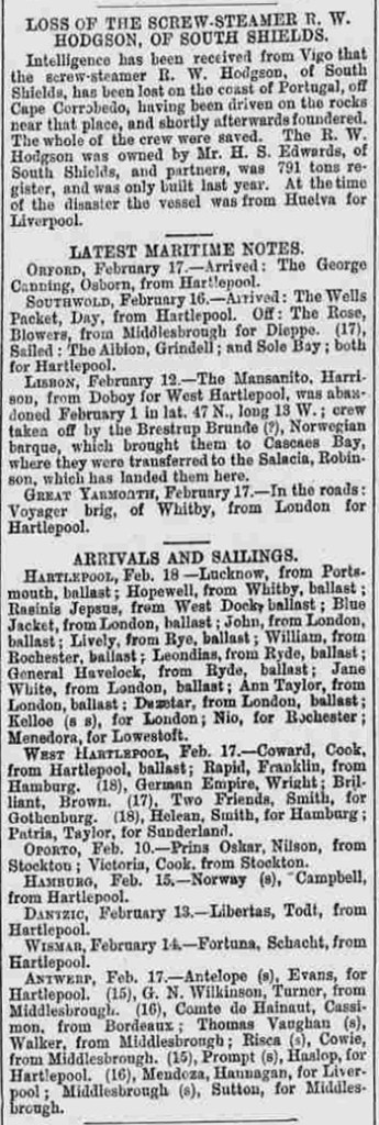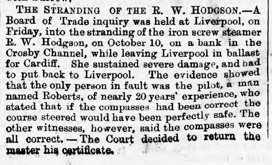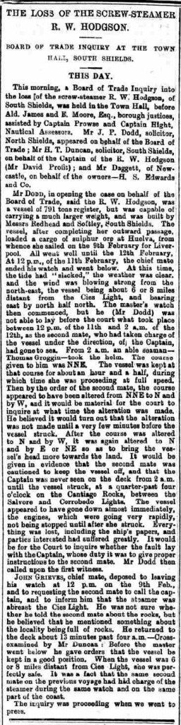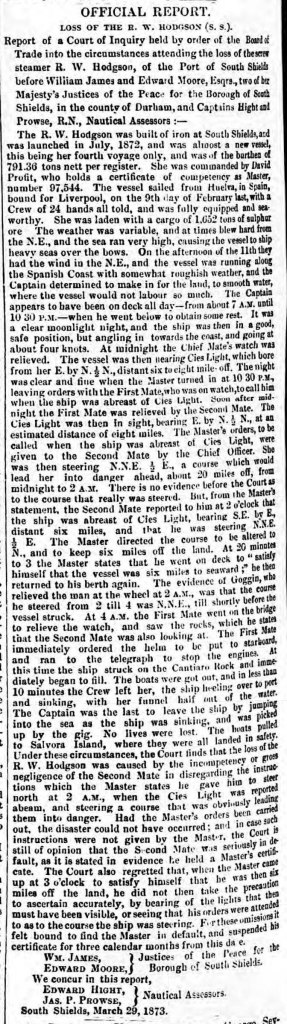 Inteligencia ha sabido de Vigo que el vapor de hélice R. W. Hodgson, de South Shields, se ha perdido en la costa de Portugal, por fuera de Cabo Corrobedo, habiendo sido conducido contra las rocas cerca de ese lugar, y poco después hundido. La totalidad de la tripulación fue salvada. El R. W. Hodgson era propiedad del señor H. S. Edwards, de South Shields, y asociados, tenía 791 toneladas de registro, y solo fue construido el año pasado. En el momento del desastre el barco iba de Huelva para Liverpool.»