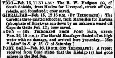 «VIGO—Feb. 13, 11.30 A.M.: El R. W. Hodgson (vapor), de South Shields, de Huelva para Liverpool, chocado por fuera de Corrobedo, y hundido; tripulación a salvo.»