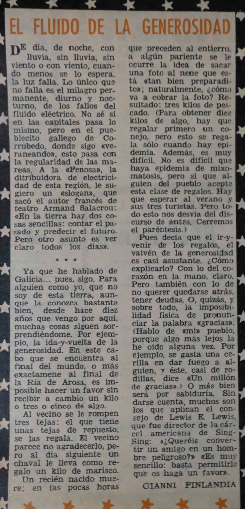 Se titulaba «El Fluido de la generosidad». Un ciento de líneas recuadradas en la contraportada y distribuidas en dos partes, la primera de las cuales ponía el acento en el lamentable suministro eléctrico que padecía el pueblo el mismo año en que—qué curioso—otro vecino extranjero se quejaba de lo mismo en una carta dirigida a La Voz de Galicia que habría de dar pie al artículo «Las tinieblas de Corrubedo»: el fotoperiodista Michael Kuh.