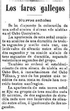En cuanto a nosotros, corría el mes de febrero de 1905 cuando periódicos como El Correo Gallego, El Eco de Santiago o La Correspondencia Gallega anunciaron la implantación de «una señal sonora ó sirena «de niebla» en el Cabo Corrubedo».