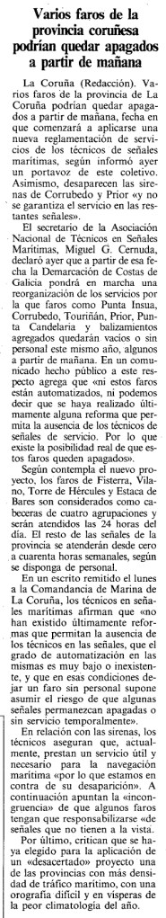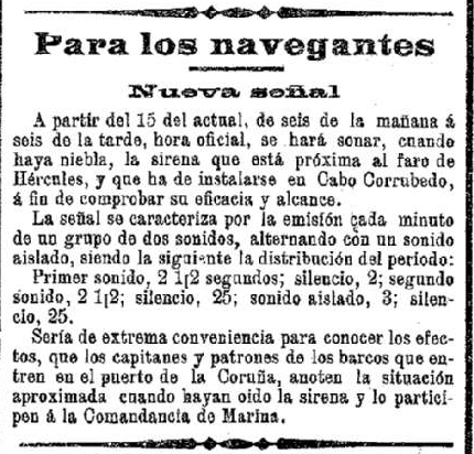 Poco antes, leemos en El Eco de Galicia que la sirena a él destinado se puso a funcionar junto a la Torre de Hércules el 15 de octubre de 1911, de seis de la mañana a seis de la tarde. Y se solicitaba a capitanes y patrones prestos a entrar con sus barcos en el puerto coruñés que anotasen la posición desde la que escucharan el dispositivo y comunicasen la misma a la Comandancia de Marina [y una curiosidad: al año siguiente, el 10 de febrero, un fuerte viento se llevó por delante la caseta donde se guardaba el aparato: así lo contó el periódico local El Noroeste dos días más tarde].