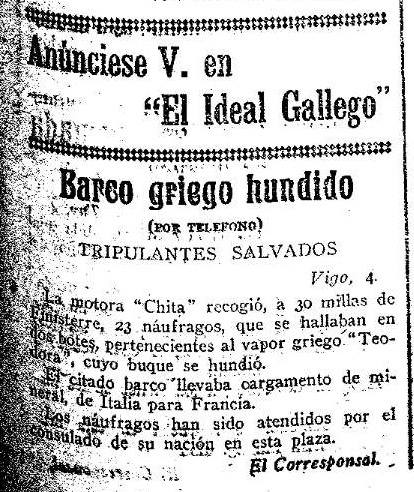 El mismo suceso en una noticia mucho más escueta publicada por El Ideal Gallego. A treinta millas de Fisterra, la motora Chita recoge a 23 náufragos que se hallaban en dos botes pertenecientes a un barco griego que se hundió. Hasta ahí, más o menos igual, aunque con una omisión flagrante: no se hace mención a ningún submarino como causa del incidente. El barco hundido iba cargado de mineral [ídem]. Viajaba de Italia a Francia [non ídem]. Y el cambio más radical: en vez de Aurore, el barco se llamaba Teodora.