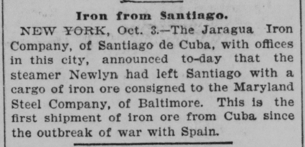 Tal vez el acontecimiento más curioso de su encarnación inicial fue el que tuvo lugar el 3 de octubre de 1898: en esa fecha, el Newlyn se convertía en el primer barco cargado con mineral de hierro capaz de abandonar la isla de Cuba tras el estallido de su guerra con España. Así lo contó, por ejemplo, The Indianapolis Journal: