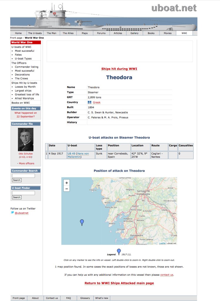 Así es. En un suceso acaecido dos días después, el Theodora se fue a pique en las siguientes coordenadas: latitud 42° 32′ N, longitud 9° 25′ O. «Near Correbedo, Spain», escribe Uboat.net, con errata incluida, además de mostrar el lugar del ataque en un plano: