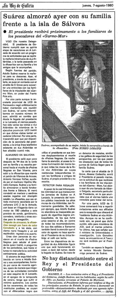 En el curso de la vida de este blog hemos dado cuenta de la visita que el general Francisco Franco, siendo jefe del Estado, hizo a nuestro pueblo con motivo de su asistencia a la festividad del Nazareno en A Pobra. También, de aquella vez en que Alfonso XIII, junto a su madre María Cristina, circunvaló nuestro cabo a bordo del yate real Giralda perseguido por los periodistas. Y ahora, aprovechando que esta semana nos estamos desayunando con las andanzas de Pedro Sánchez Pérez-Castejón durante sus vacaciones marroquíes ataviado con una fachona gorra a lo Peaky Blinders, se nos ha ocurrido rememorar la ocasión en que un descocado y pecho al viento Adolfo Suárez, primer presidente de la Democracia, anduvo de pesca por nuestras aguas en una suerte de calma en medio de la tempestad política.