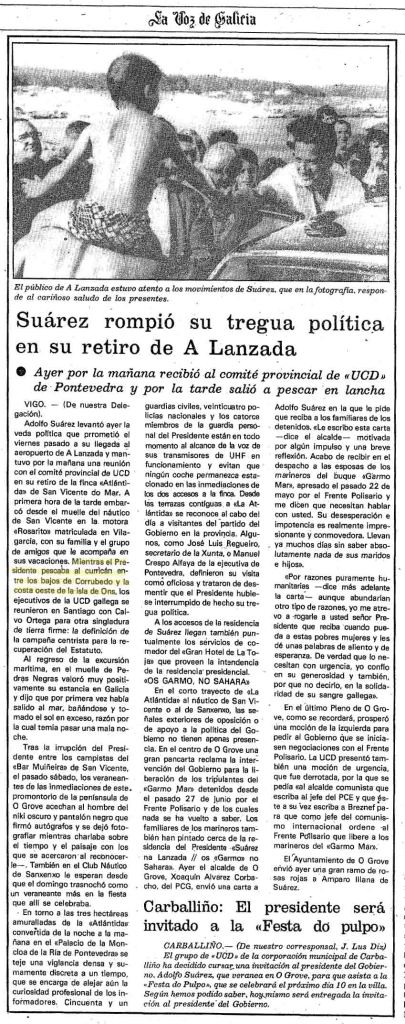 Las vacaciones de Adolfo Suárez en Galicia duraron veinte días y aún hoy se escribe sobre aquella estancia en artículos de lo más variado [dejamos abajo el enlace de algunos] que ponen el foco en temas concretos como la gestación de nuestro Estatuto de Autonomía o la pericia del presidente pescando tiburones —tintoreras— en la ría de Pontevedra.