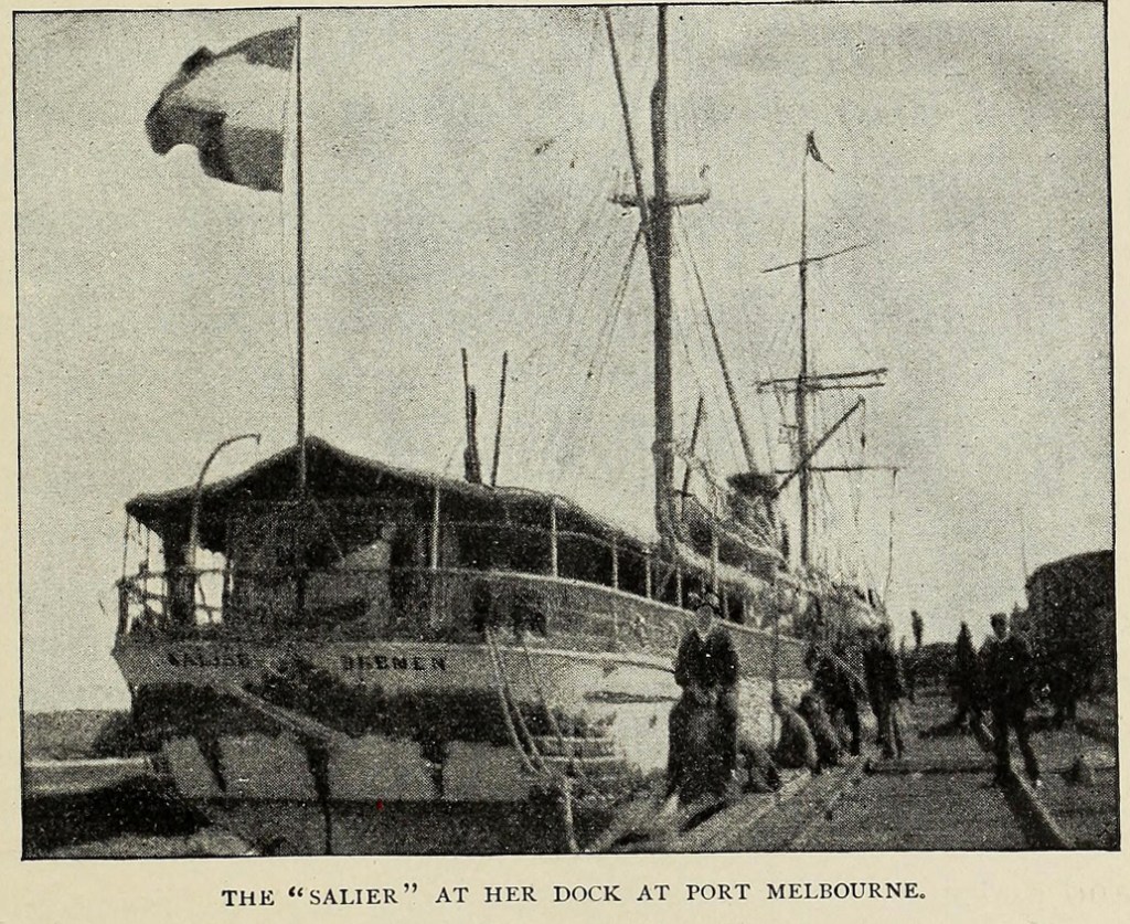 En cualquier caso, el viaje estuvo exento de contratiempos y el Salier hizo escala en Amberes, Port Said y Adén. Por fin, poco después de la medianoche del sábado 28 de agosto, tocaba por primera vez tierra aussie al atracar en el puerto de Largs Bay, al oeste de Adelaida.