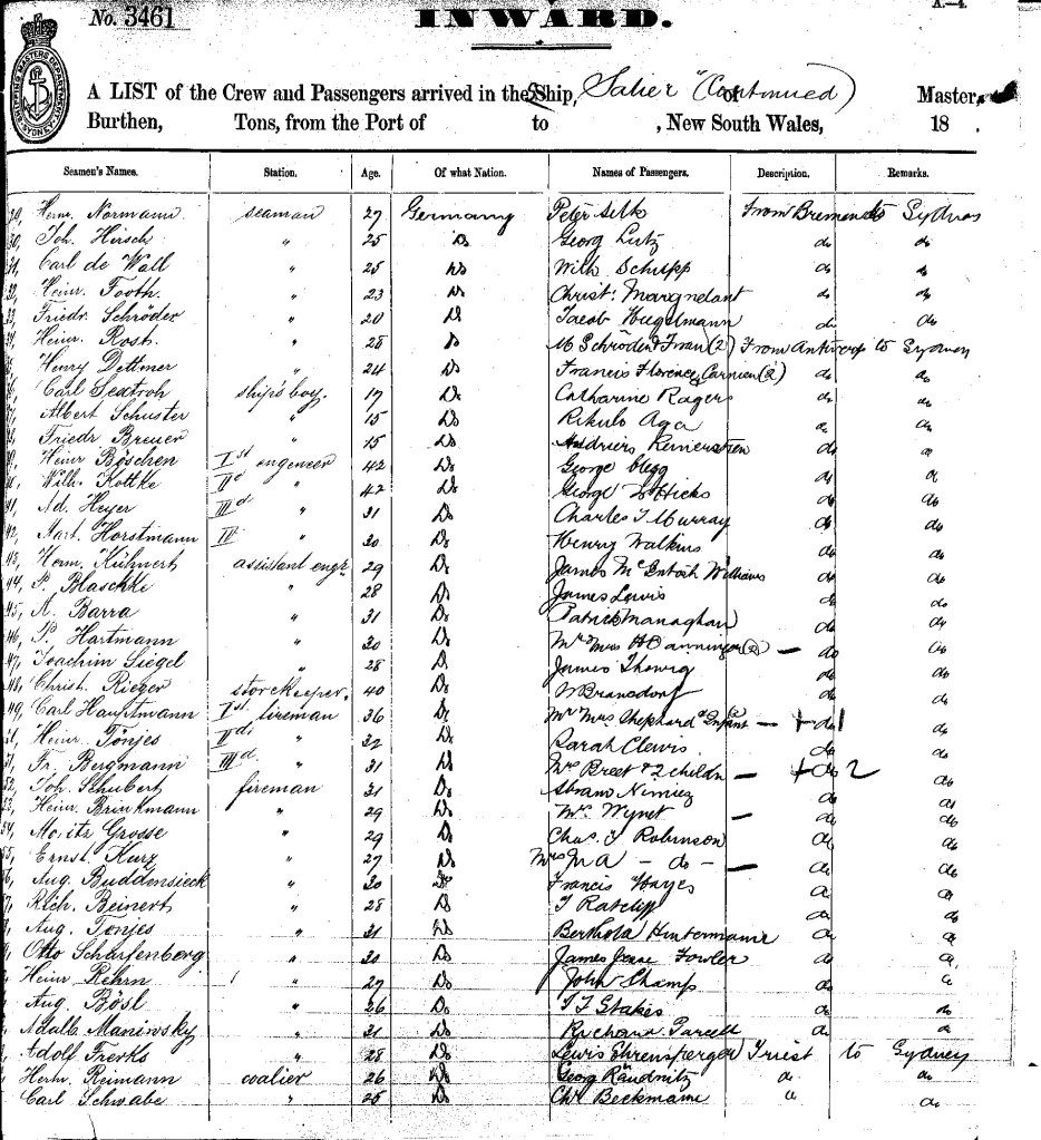 Para acabar, el Salier hizo dos escalas más en Merbourne y Sidney, ciudad esta última de la que hemos logrado hallar dos documentos con la lista de los pasajeros y la tripulación participantes en aquella travesía inaugural. Aquí los tenéis: