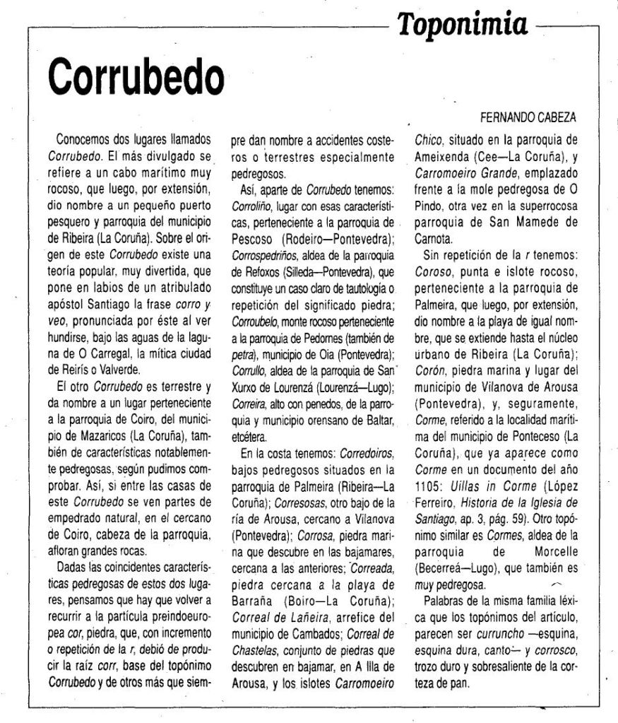 Leemos al respecto un artículo que lleva su firma publicado el 29 de julio de 1990 en La Voz de Galicia bajo el titular de «Corrubedo». El texto comienza explicando que se conocen dos lugares llamados Corrubedo: el nuestro (aquí desliza la teoría del apóstol, a la que califica de «muy divertida») y el perteneciente a la parroquia de Coiro, en el municipio coruñés de Mazaricos. Y deduce: «Dadas las coincidentes características pedregosas de estos dos lugares, pensamos que hay que volver a la partícula preindoeuropea cor, piedra, que, con incremento o repetición de la r, debió de producir la raíz corr, base del topónimo Corrubedo y de otros que siempre dan nombre a accidentes costeros o terrestres especialmente pedregosos».