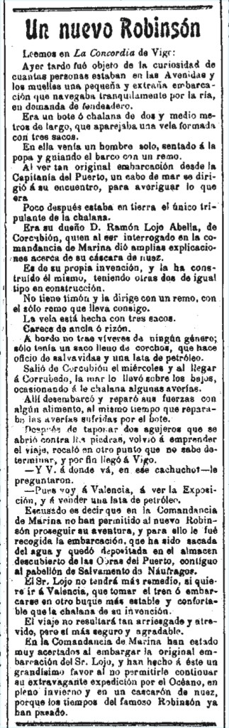 Ramón relató su corta aventura que, indefectiblemente, salió publicada en varios periódicos. Primero, en La Concordia de Vigo y, de ahí, con textos casi idénticos en algunos casos, rebotó a otros rotativos como El Eco de Galicia, El Correo de Galicia, El Correo Gallego, España Nueva o El Globo. En ellos cuajó el titular un tanto irónico de «Un nuevo Robinsón».
