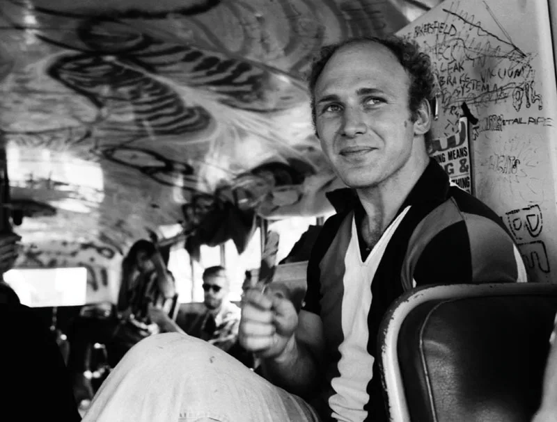 Ahora bien. Ken no pensaba ir solo ni en blanda excursión familiar. Qué va. El autor, poco después de acabar su segunda novela —la infravalorada Sometimes a Great Notion, arborescente epónimo contracultural de la inasible Gran Novela Americana— reclutó a una cohorte de amigos y amigos de amigos y, para acomodarlos, se hizo con un vetusto pero práctico autobús escolar amarillo canario. Lo tunearon. Desparramaron todos los colores del arco iris sobre la carrocería. Y encima del parabrisas, en el panel habilitado para indicar el destino de cada trayecto colegial, pintaron: «Furthur», que más tarde cambiarían por «Further» (‘Más Allá’). Toda una declaración de intenciones.