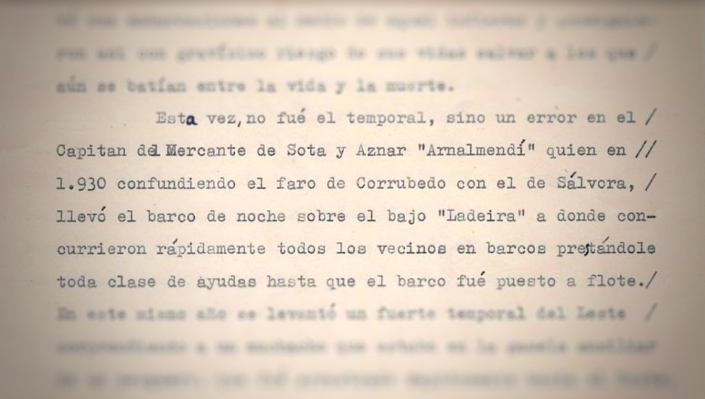 Dentro del inventario de heroicidades que el joven cura de Corrubedo José Antonio Ríos Mosquera recogió en su carta, había una referencia a un mercante al que llamó «Arnalmendí». Los hechos, descritos con la imperfecta pero rumbosa tipografía de las máquinas de escribir de antaño, habrían ocurrido en 1930. Una noche, el Arnalmendí encalló en el bajo de A Ladeira: el capitán habría confundido las luces de los faros de Corrubedo y Sálvora. El suceso no revistió mayor gravedad porque —explicó en su misiva el clérigo— «concurrieron rápidamente todos los vecinos en barcos prestándole todo clase de ayudas hasta que el barco fue puesto a flote».