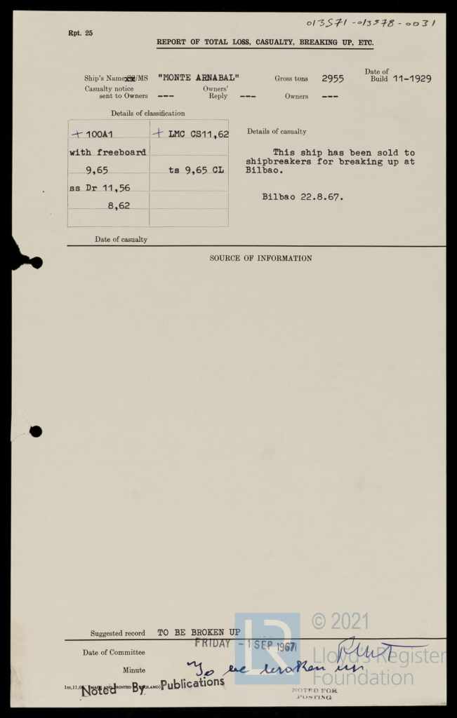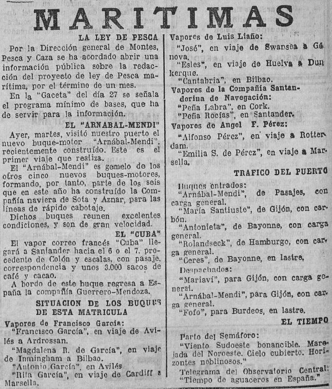 Pero ocupémonos del nuevo Arnabal Mendi y del lance que justifica este post. El buque fue empleado en una línea regular de cabotaje por los puertos de España ─de País Vasco a Cataluña y viceversa─ transportando mercancías de toda índole: lo que técnicamente se denominaba ‘carga general’. Así, según informó el periódico El Cantábrico, el 3 de diciembre de 1929 la motonave hacía escala en Santander procedente de Pasajes en lo que constituyó su primer viaje.