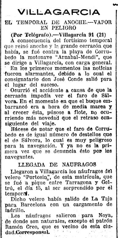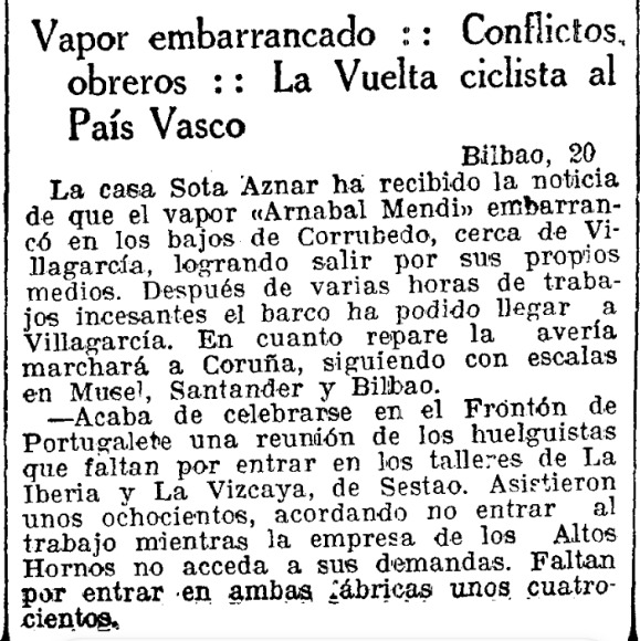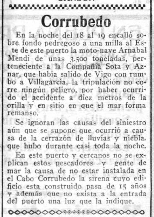 Nueve meses después, el viernes 5 de septiembre de 1930, el buque zarpaba del puerto de Barcelona en una singladura que ─anunció Sota y Aznar en la prensa─ lo habría de hacer tocar Valencia, Alicante, Almería, Málaga, Sevilla, Cádiz, Vigo, Vilagarcía, A Coruña, Gijón, Santander y Bilbao. Cumpliendo esta hoja de ruta, el jueves 18 salía de Vigo rumbo a Vilagarcía, pero en una noche cerrada, preñada de lluvia y niebla, el Arnabal Mendi encalló —según El Ideal Gallego— a una milla al este del puerto de Corrubedo [entonces un playazo donde echar el ancla puesto que, como contamos en su día, nuestro muelle no se habría de construir hasta unos años más tarde]. «La tripulación no corrió ningún peligro —explicaba el periódico coruñés—, por haber ocurrido el accidente a diez metros de la orilla y en sitio en que el mar forma remanso».