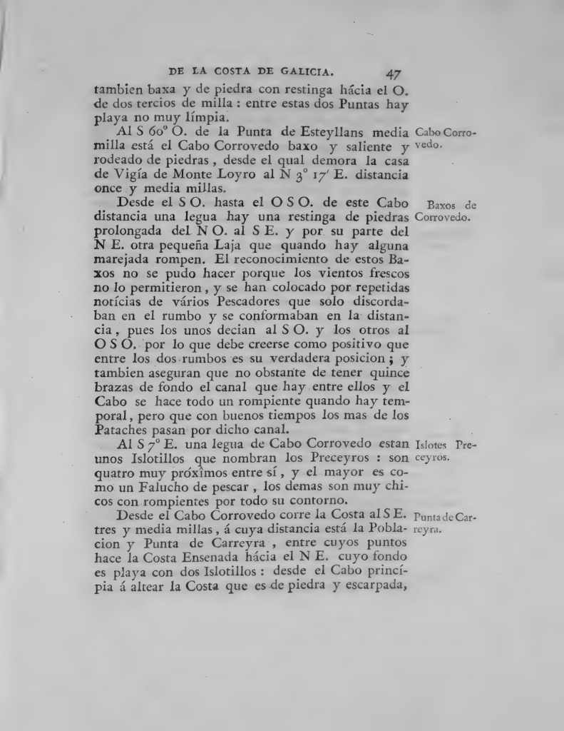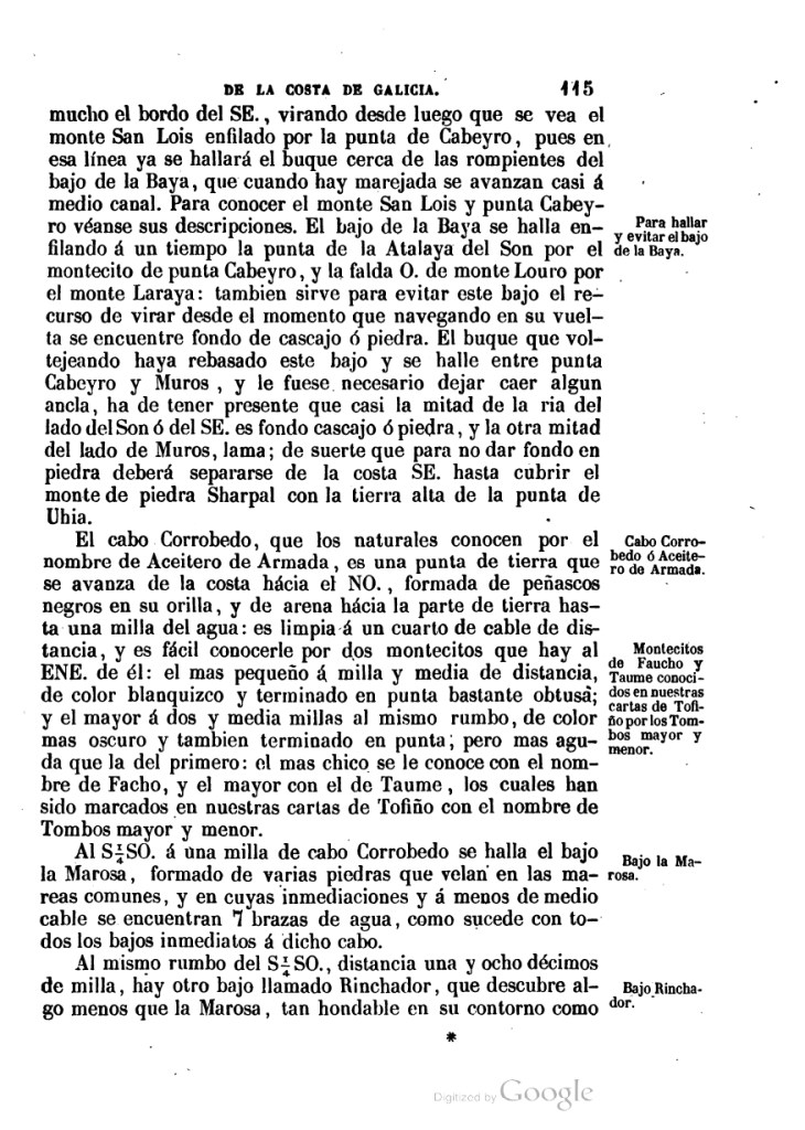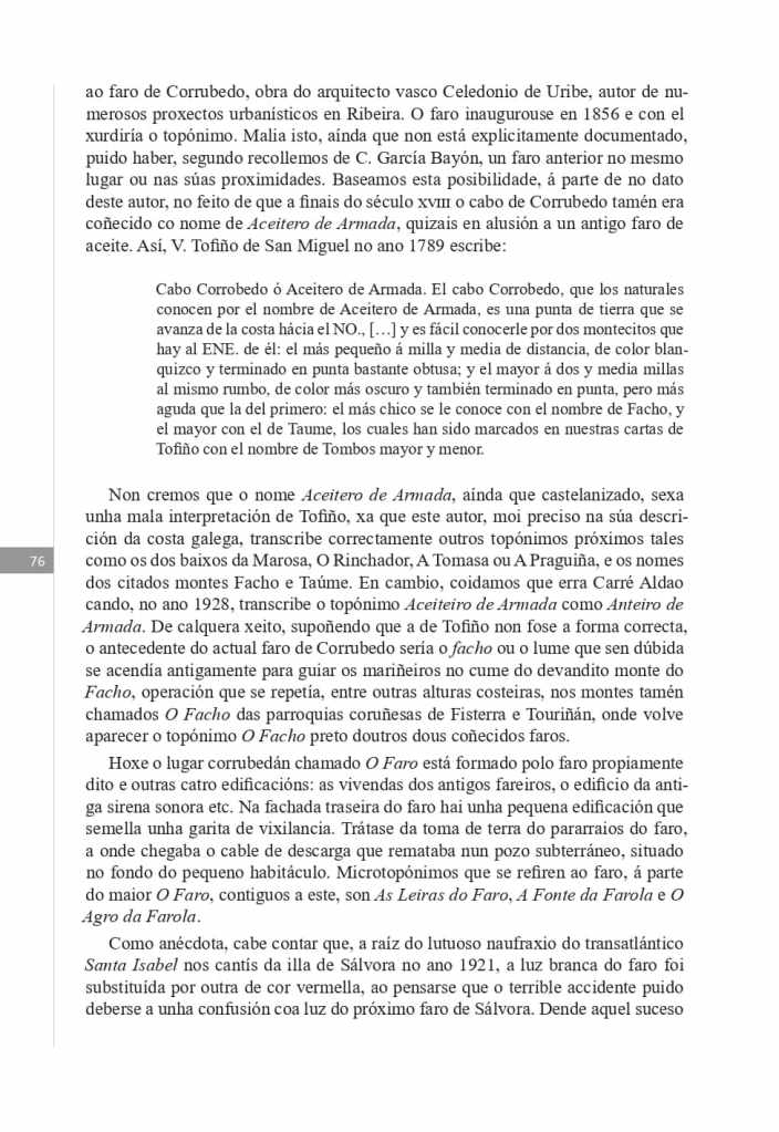 «Cabo Corrobedo ó Aceitero de Armada. El cabo Corrobedo, que los naturales conocen por el nombre de Aceitero de Armada, es una punta de tierra que se avanza de la costa hácia el NO., formada de peñascos negros en su orilla, y de arena hácia la parte de tierra hasta una milla del agua: es limpia á un quarto de cable de distancia, y es fácil conocerle por dos montecitos que hay al ENE. de él: el mas pequeño á milla y media de distancia, de color blanquizco y terminado en punta bastante obtusa; y el mayor á dos y media millas al mismo rumbo, de color mas oscuro y tambien terminado en punta; pero mas aguda que la del primero: el mas chico se le conoce con el nombre de Facho, y el mayor con el de Taume, los quales han sido marcados en nuestras cartas de Tofiño con el nombre de Tombos mayor y menor.»