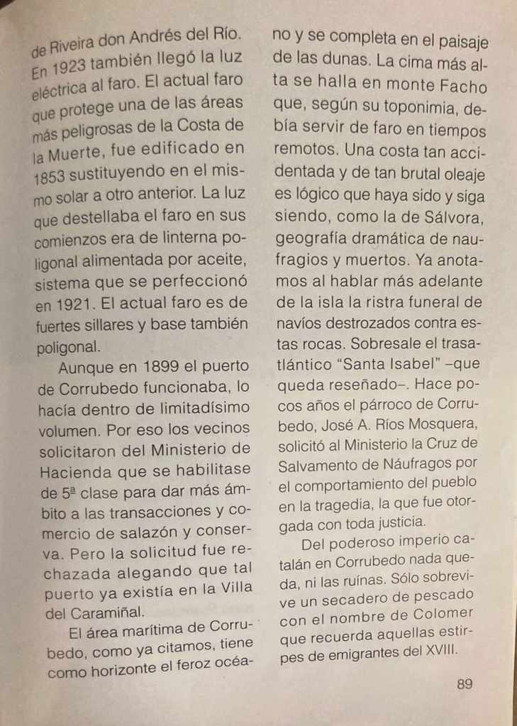 La primera vez que leímos sobre la posibilidad de un faro anterior al faro fue en Toponimia de Ribeira, de Fernando Cabeza Quiles, publicado por la Real Academia Galega en 2023. Lo hace precisamente al abordar la etimología del lugar corrubedano de ‘O Faro’