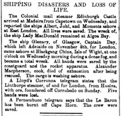 Los detalles son escasos. Los datos, en algún fleco, erróneos (dos rotativos atribuyen el barco a su propietario anterior, tal vez confundidos por los datos de la Lloyd). Pero a finales de marzo se da cuenta del fallo del Board of Trade, esto es, de la investigación impulsada por el tribunal mercantil competente para determinar las responsabilidades en el siniestro.