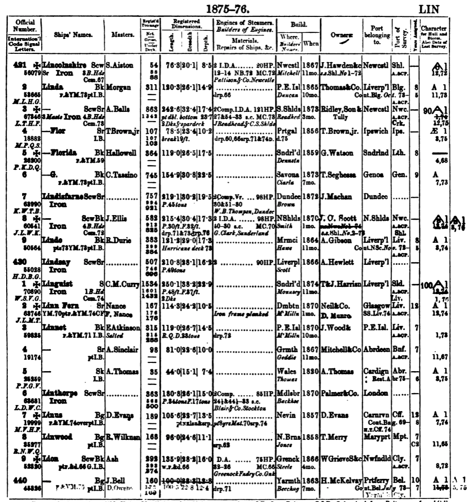 En 1873, el Linthorpe tiene un nuevo propietario. Su nombre es Chas. O. Palmer. El barco mantiene su base en Londres y, curiosamente, es con este personaje cuando aparece por primera vez en los interminables listados de buques (dignos antepasados de las tablas de Excel) que publicaba todos los años la Lloyd Register.