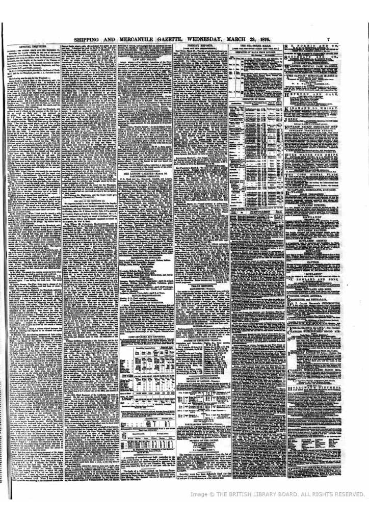 No hubo otra que dejarnos los ojos (luego encontramos otro periódico algo más nítido, aunque siguió suponiendo todo un desafío para la IA). El juicio se celebró en Sunderland ante el señor F. Ritson y el doctor J. P. Pyle, de resultas de una investigación dirigida por L. V. Hamil. El grueso del texto corresponde a los testimonios de varios tripulantes: los antes mencionados primer oficial y contramaestre, el jefe de máquinas John Hill y el capitán Read, en su caso por boca del señor Oliver, del bufete de abogados Oliver and Botterell.