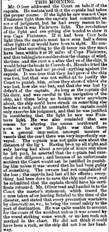 El abogado de la defensa, señor Oliver, sostuvo en su alegato final que «si la luz que vio no era la del Cabo Fisterra, entonces el capitán habría cometido un error de juicio, pero tenía todas las razones para creer que sí lo era» y también que «si hubiera sido la luz de Corrubedo, el capitán habría observado otra media docena de luces que habrían estado a la vista». También insistió en que la costa estaba insuficientemente cartografiada y que el capitán había dormido tan solo dos horas desde que zarparan de puerto. Y que con el naufragio perdió todos sus efectos personales.