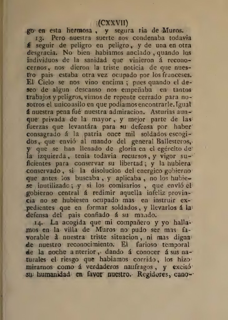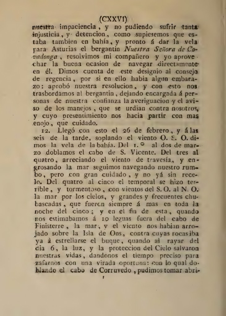 «Llegó con esto el 26 de febrero, y á las seis de la tarde, soplando el viento O. E. O. dimos la vela de la bahía. Del 1.º al dos de marzo doblamos el cabo de S. Vicente. Del tres al quatro, arreciando el viento de travesía, y engrosando la mar seguimos navegando nuestro rumbo, pero con gran cuidado, y no yá sin recelo. Del quatro al cinco el temporal se hizo terrible, y tormentoso, con vientos del S. O. al N. O. la mar por los cielos, y grandes y frecuentes chubascadas, que fueron siempre á mas en toda la noche del cinco; y en el fin de esta, quando nos estimabamos á 10 leguas fuera del cabo de Finisterre, la mar, y el viento nos habían arrojado sobre la Isla de Ons, contra cuyas rocas iba ya a estrellarse el buque, quando al rayar del día 6, la luz, y la protección del Cielo salvaron nuestras vidas, dandonos el tiempo preciso para zafarnos con una virada oportuna: con lo qual doblando el cabo de Corruvedo, pudimos tomar abrigo en esta hermosa, y segura ria de Muros.»