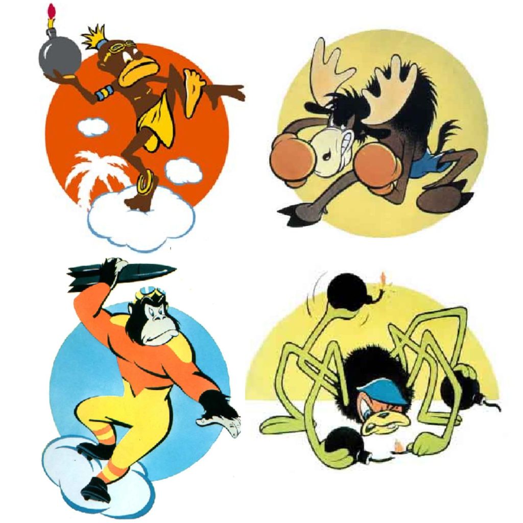 He ahí la belicosa imagen que el departamento de insignias militares de Walt Disney Studios diseñó para el 452nd Bombardment Squadron. Tras Pearl Harbor (7 de diciembre de 1941) la célebre compañía de dibujos animados había puesto varias manos y mentes supercreativas al servicio de las fuerzas armadas norteamericanas y, dentro de esta colaboración cartoneesco-militarista, entraron los cuatro escuadrones del 322nd Bombardment Group, que había sido activado el 17 de julio de 1942 y destinado a la base aérea de McDill Field (Florida): un indígena africano para la 449nd, un alce boxeador para la 450nd, un gorila surfeador de nubes para la 451nd y el mencionado artificiero arácnido para la 452nd… Aunque el emblema oficial del grupo era algo más sobrio, a base de figuras geométricas en amarillo oro y azul ultramar, y un latinajo motivacional como lema: «Recte Faciendo Neminem Timeo».